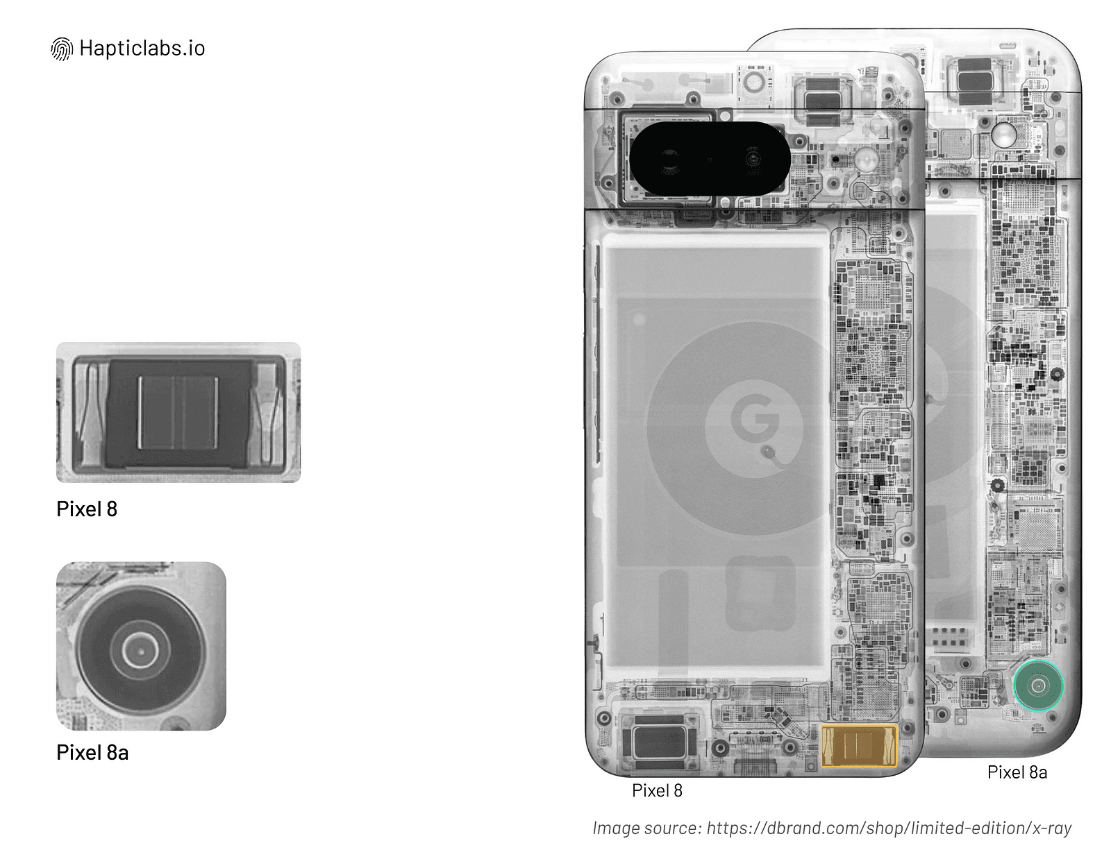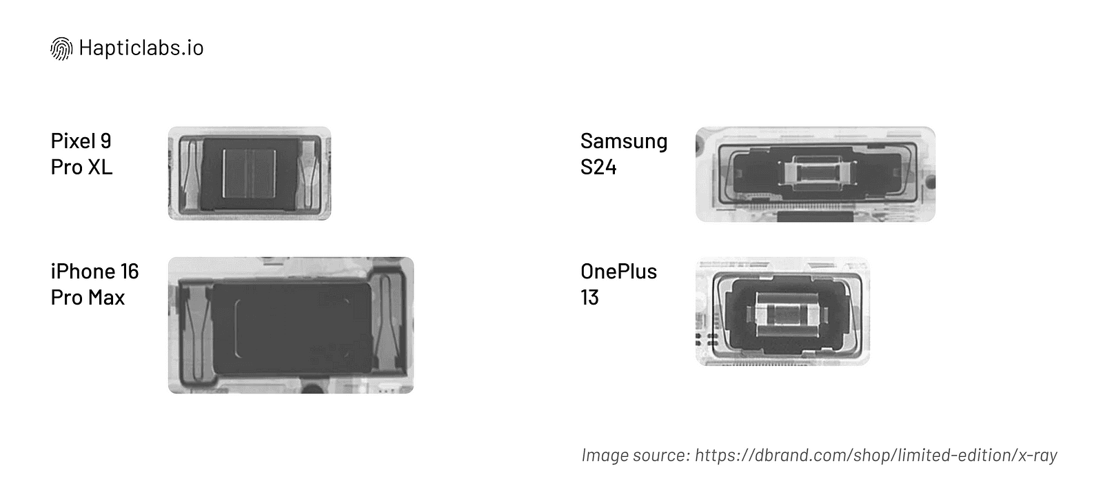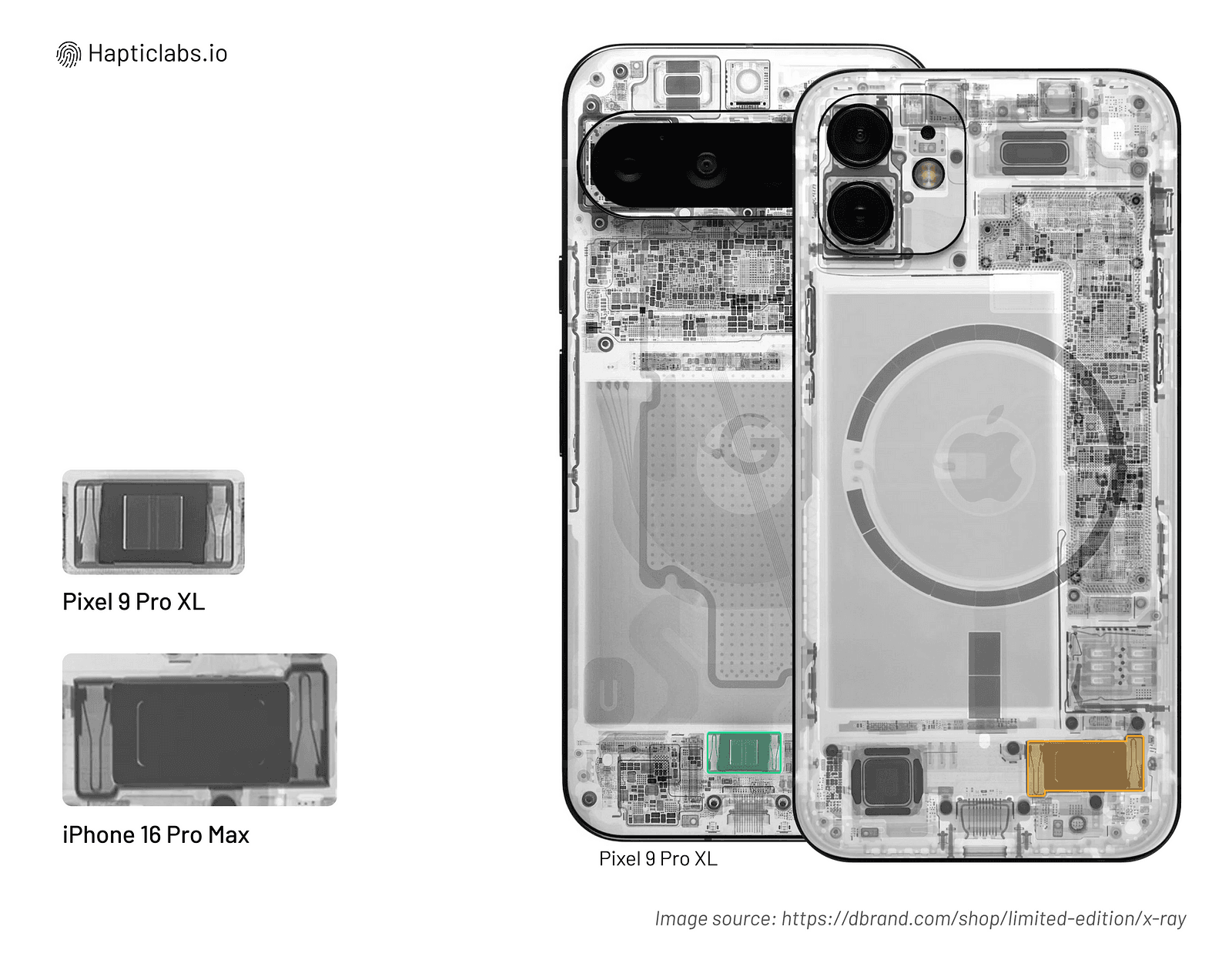 Examining the latest models from Apple and Google reveals that their underlying haptic mechanics have grown more similar over the years. Shown bellow are X-rays of a iPhone 16 Pro Max and Pixel 9 Pro XL. In both devices, the wideband actuator features a mass suspended between two springs, one on each side. Spot a difference in size?