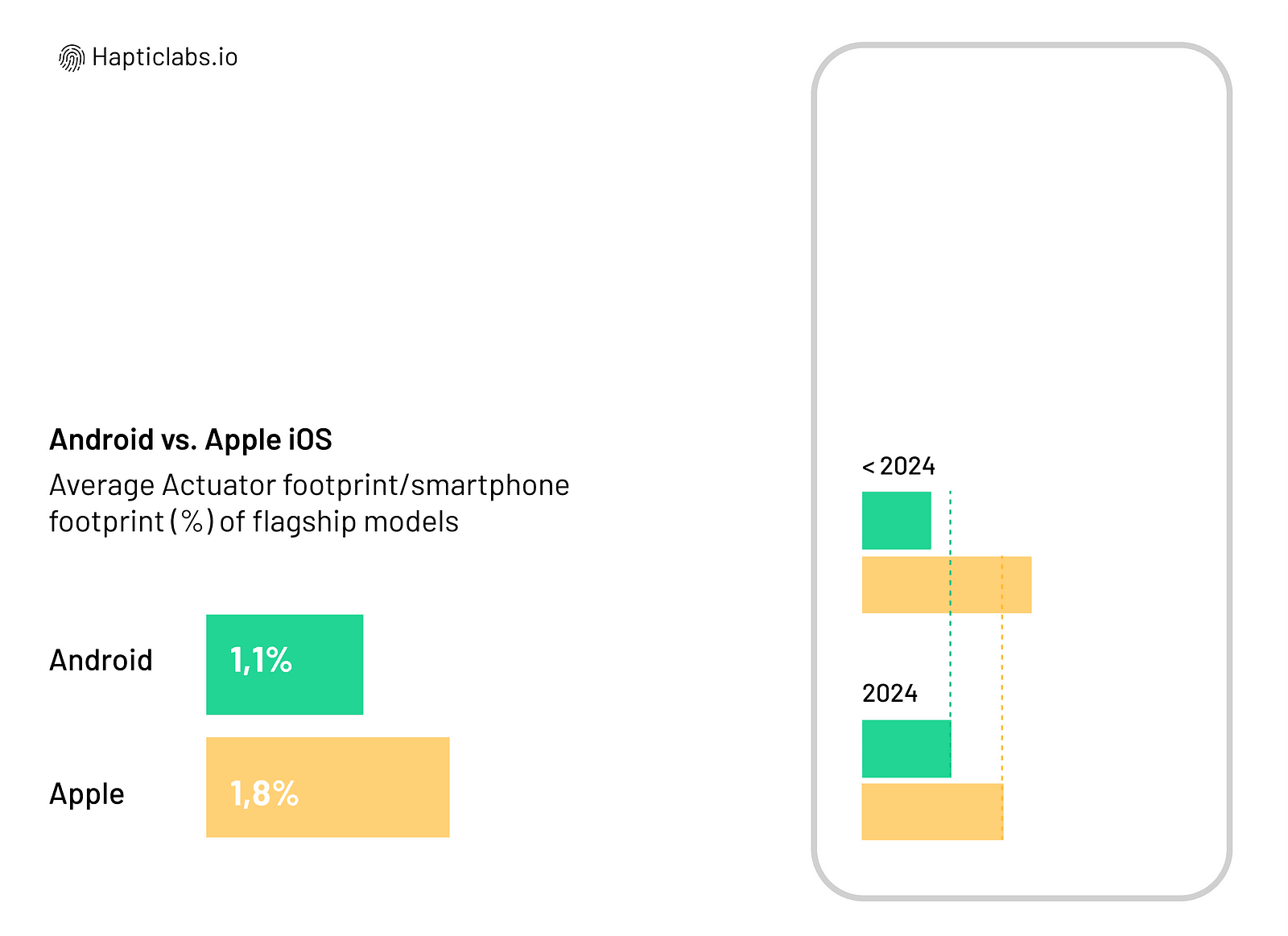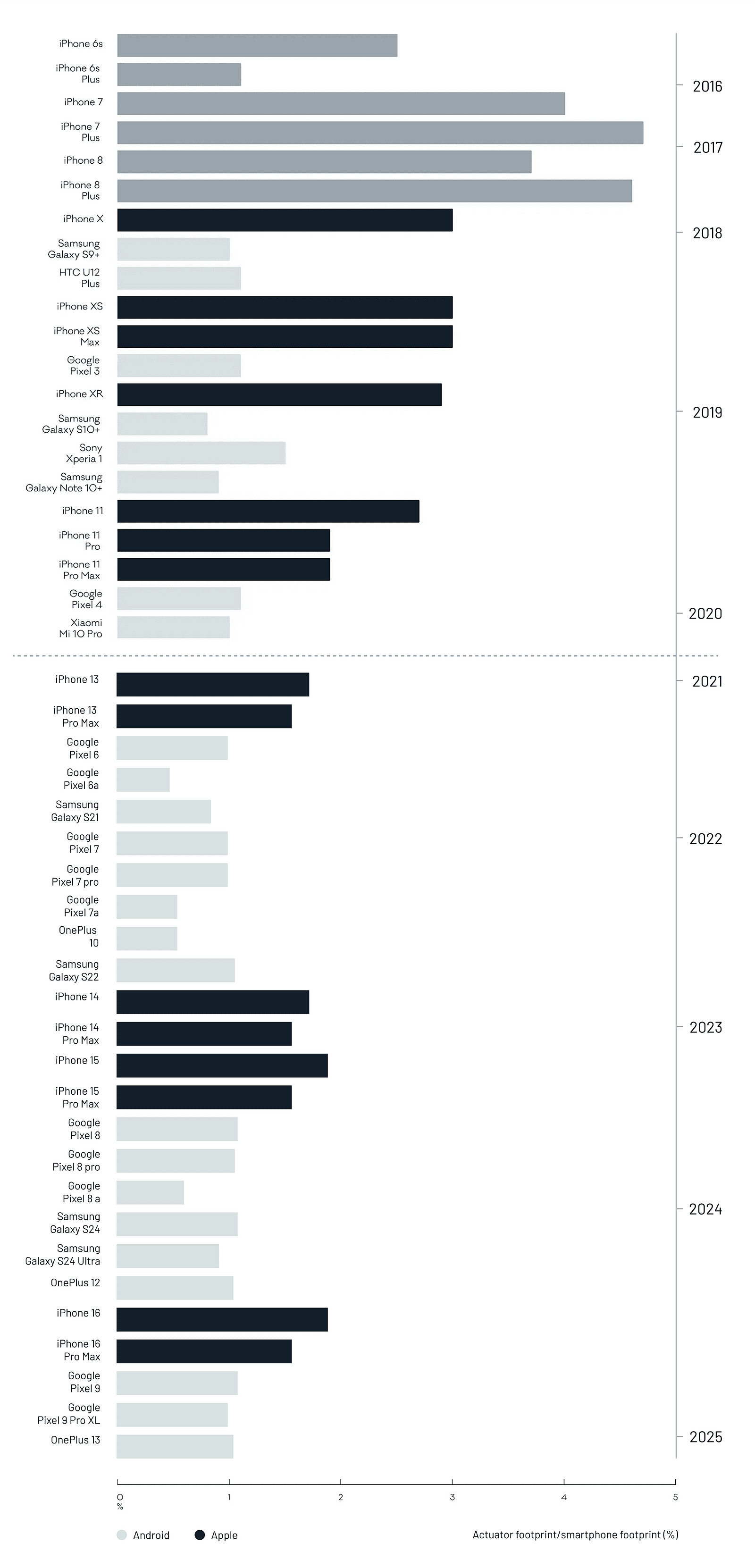 Averaging the results from 2024 devices and comparing it to models between 2018 and 2020, the actuator/ smartphone ratio indicates a decline in the Apple ecosystem as well as an increase of footprint for Android devices - Still, Android devices average an about 35% smaller actuator size.